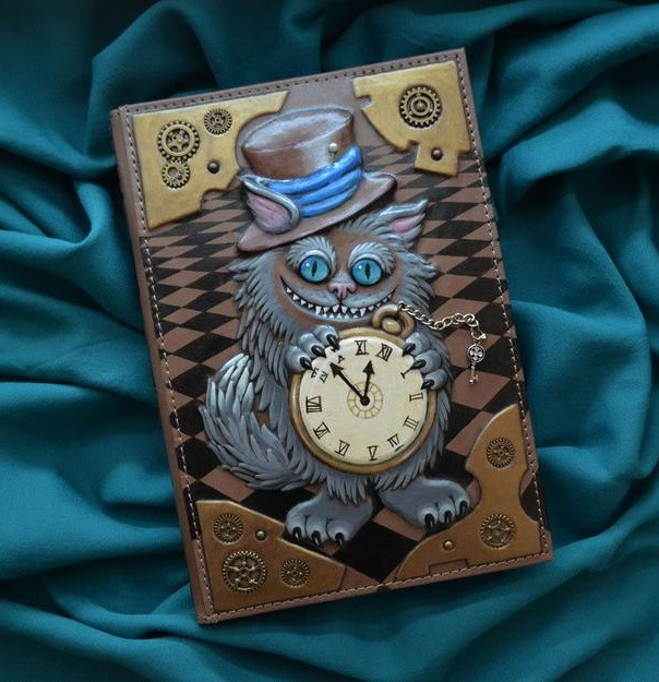 Блокнот виконаний у вигляді знімною шкіряної обкладинки, декорованого складним 3D-тисненням (складне багаторівневе тиснення з чорнінням і промальовуванням зображення) Чеширського кота, зробленим вручну. Щоденник, який вставлений всередину, - в подарунок.
