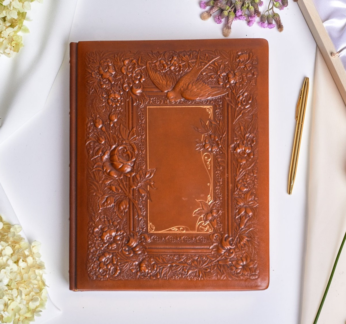 Всередині книги знаходиться 80 аркушів (160 сторінок) високоякісної французької паперу, щільності 110г / м2. Торці блоку вручну золотяться нашими майстрами, що надає виробу особливий шарм і презентабельний вигляд.