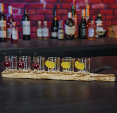 Набір із 6 чарок "Фруктове асорті" з художнім вставками (вишня, мандарин) на дерев'яній підставці