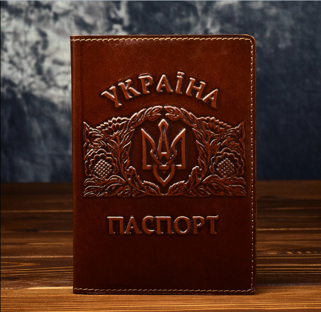 Обкладинка на паспорт з натуральної шкіри з об'ємним тисненням «Герб України».